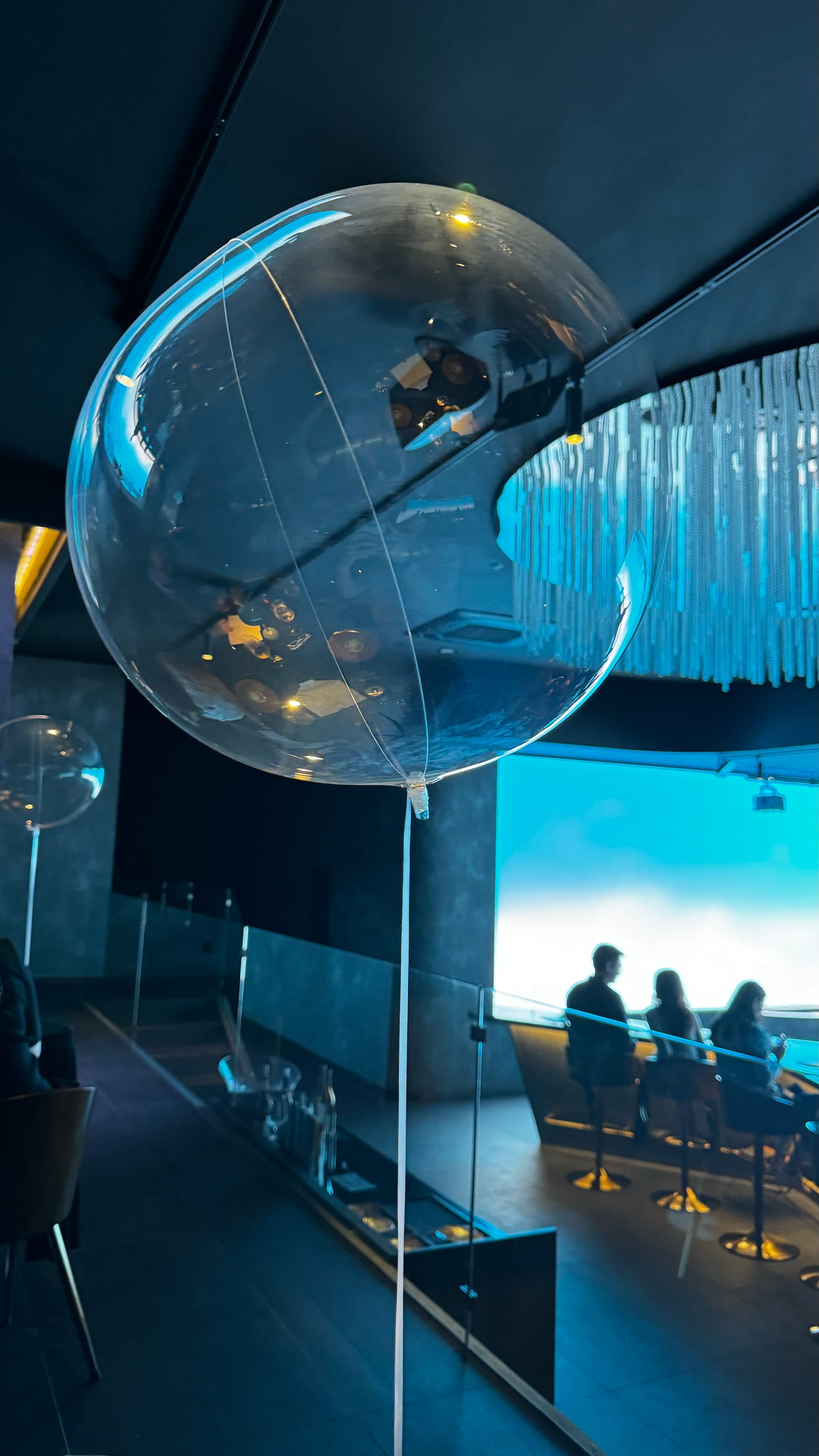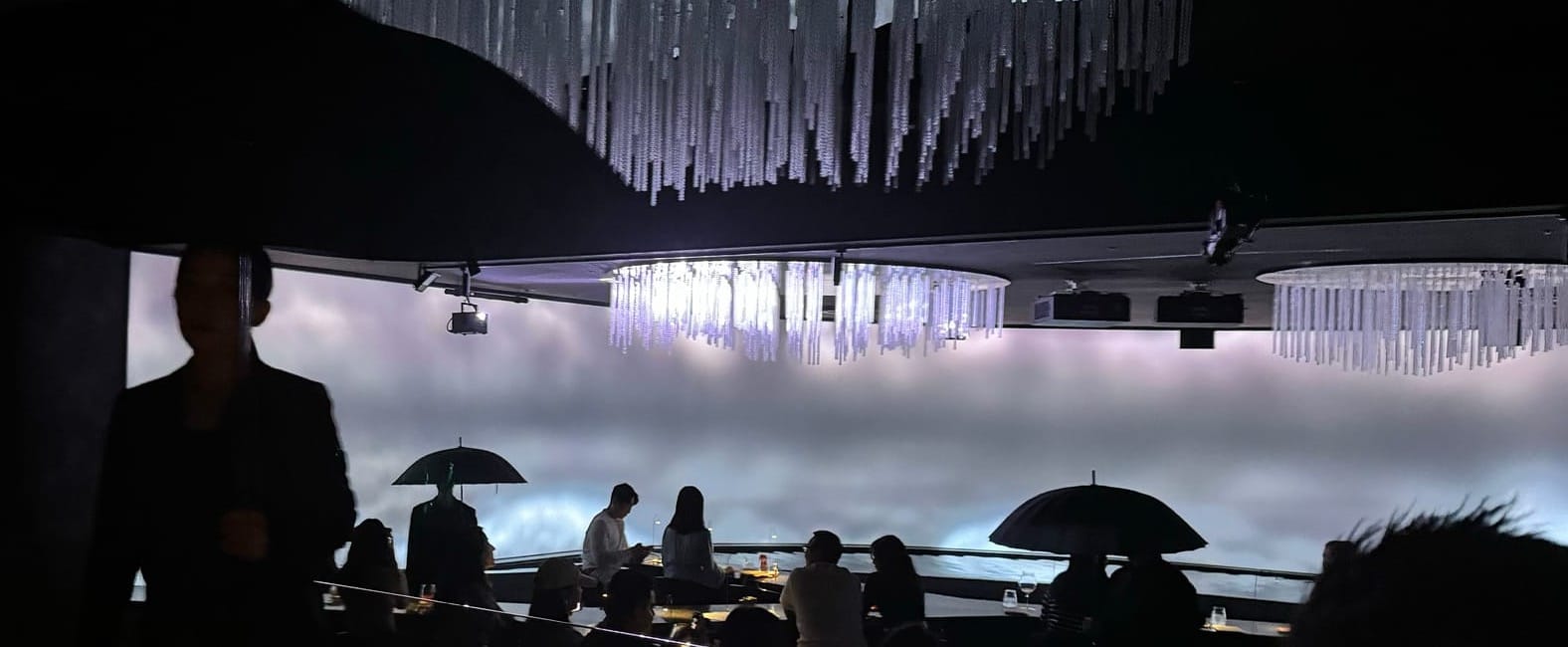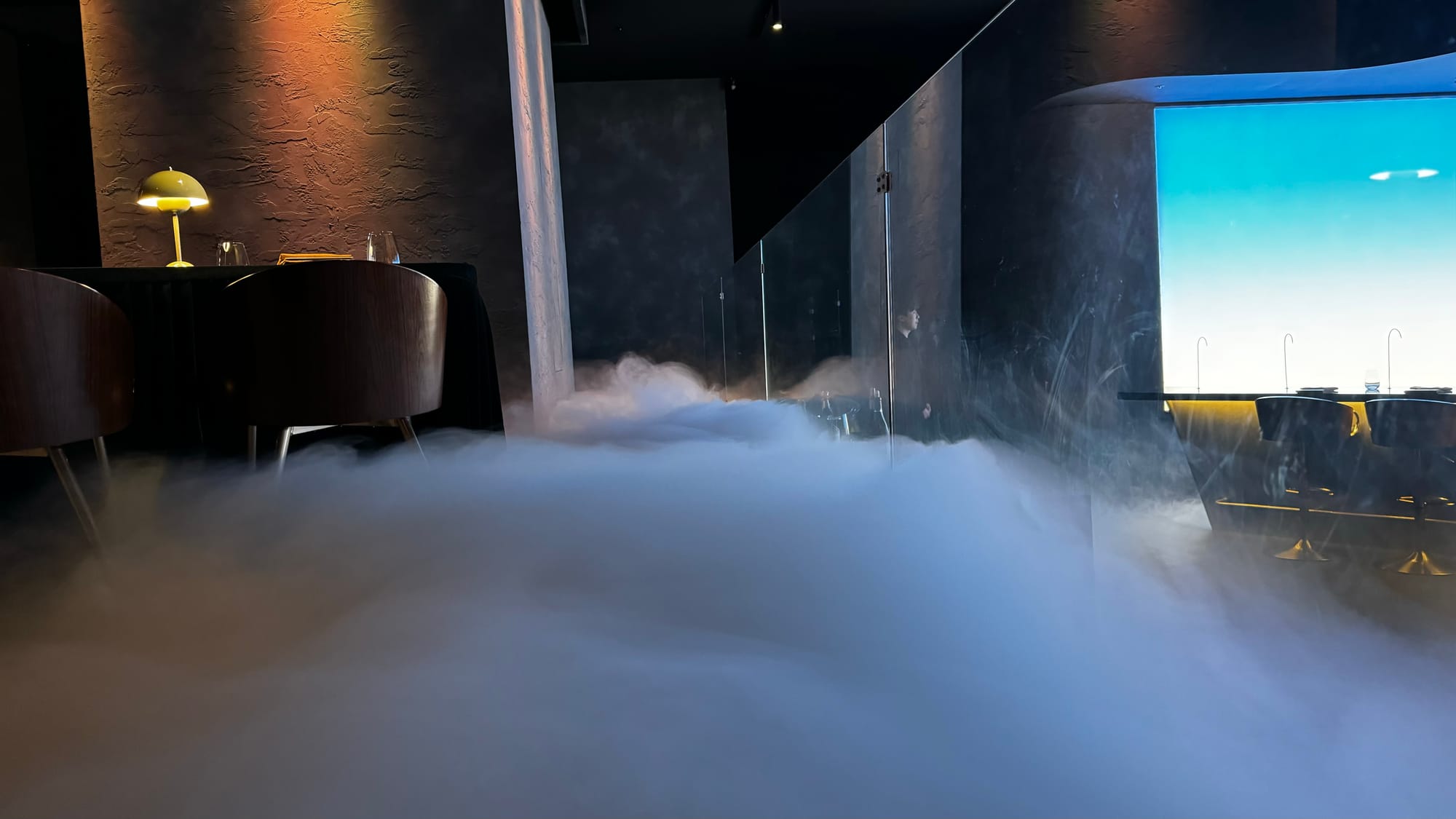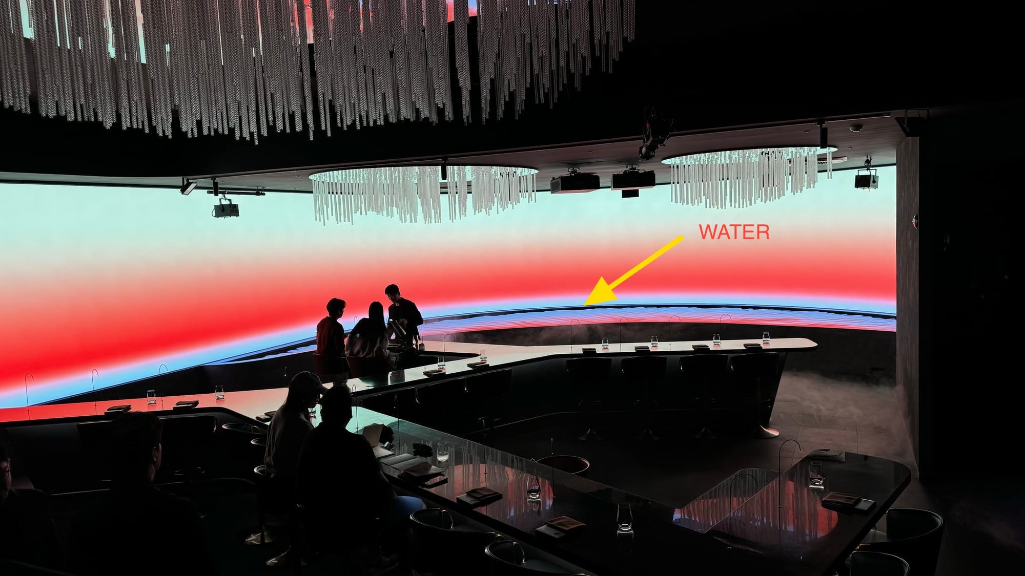 This restaurant is very dark and moody and when you walk in you notice the visually stunning wall dancing with colour over a wavy pond and smoke along the floor. We were a group of 4 so we had a table, but down below as a layout of bar seats facing the colour wall. Everyone was experiencing and eating at the same time as this was sort of a show also. The screen changed throughout depending on what course we were on, depicting sunrise, sunset, and during the Wave Storm, roll clouds and lightning appeared.