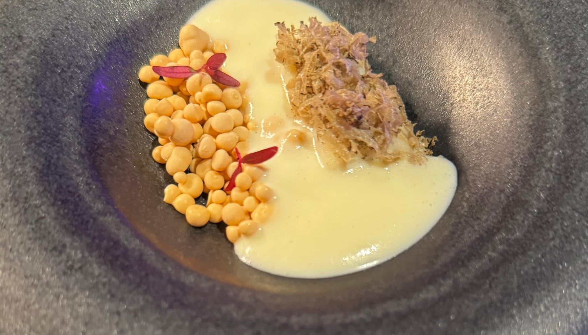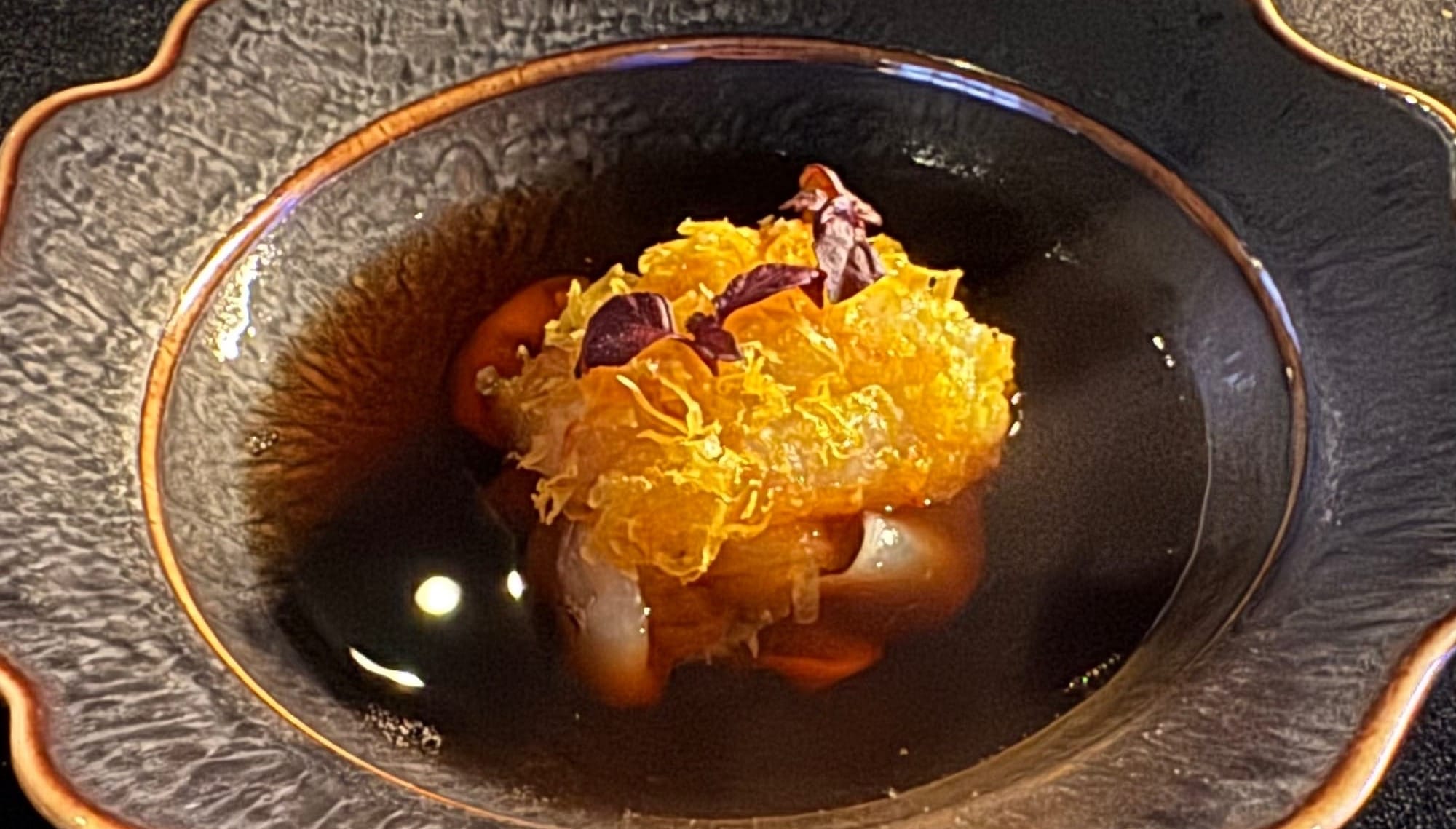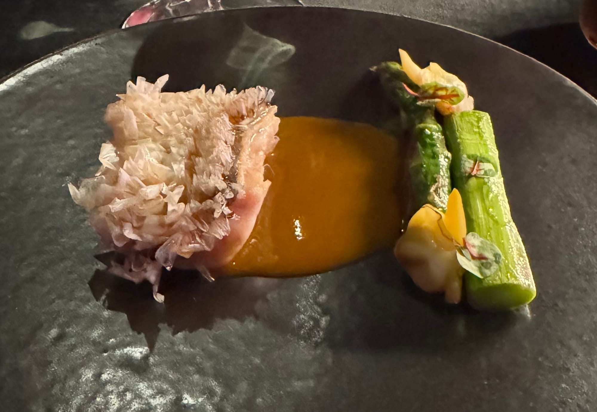 This next dish had me worried, but I think it was my favourite dish of the night. Monkfish liver, smoked eel, onion and black truffle. The truffle was not overpowering and I think I was more worried about eating the monkfish liver, but to my surprise, it was my favourite taste of the night. Creamy smooth and so damn good. The creamy stuff was an onion sauce. The monkfish liver was freeze dried so when you put it in your mouth it melted… and I even at the eel.
