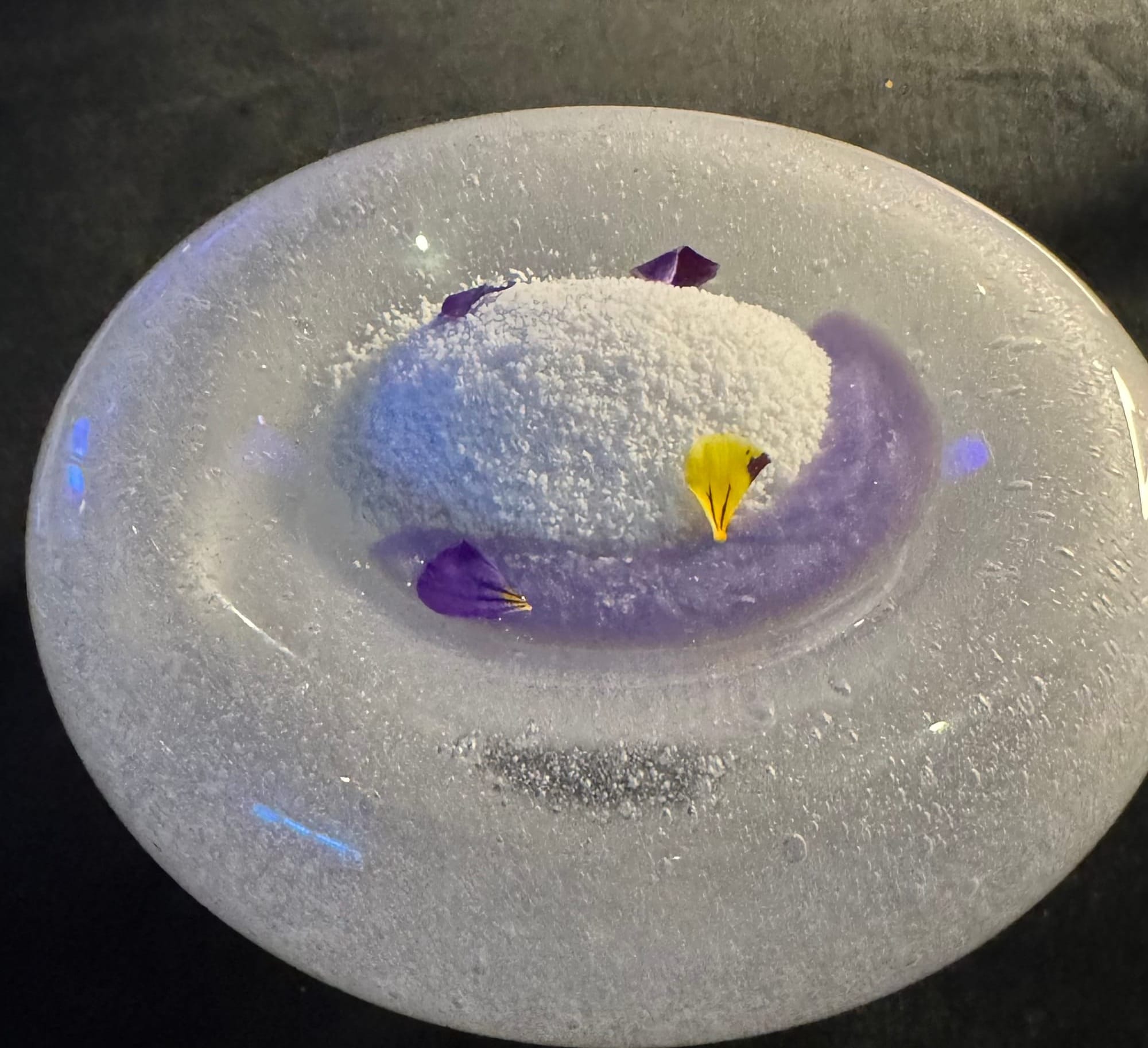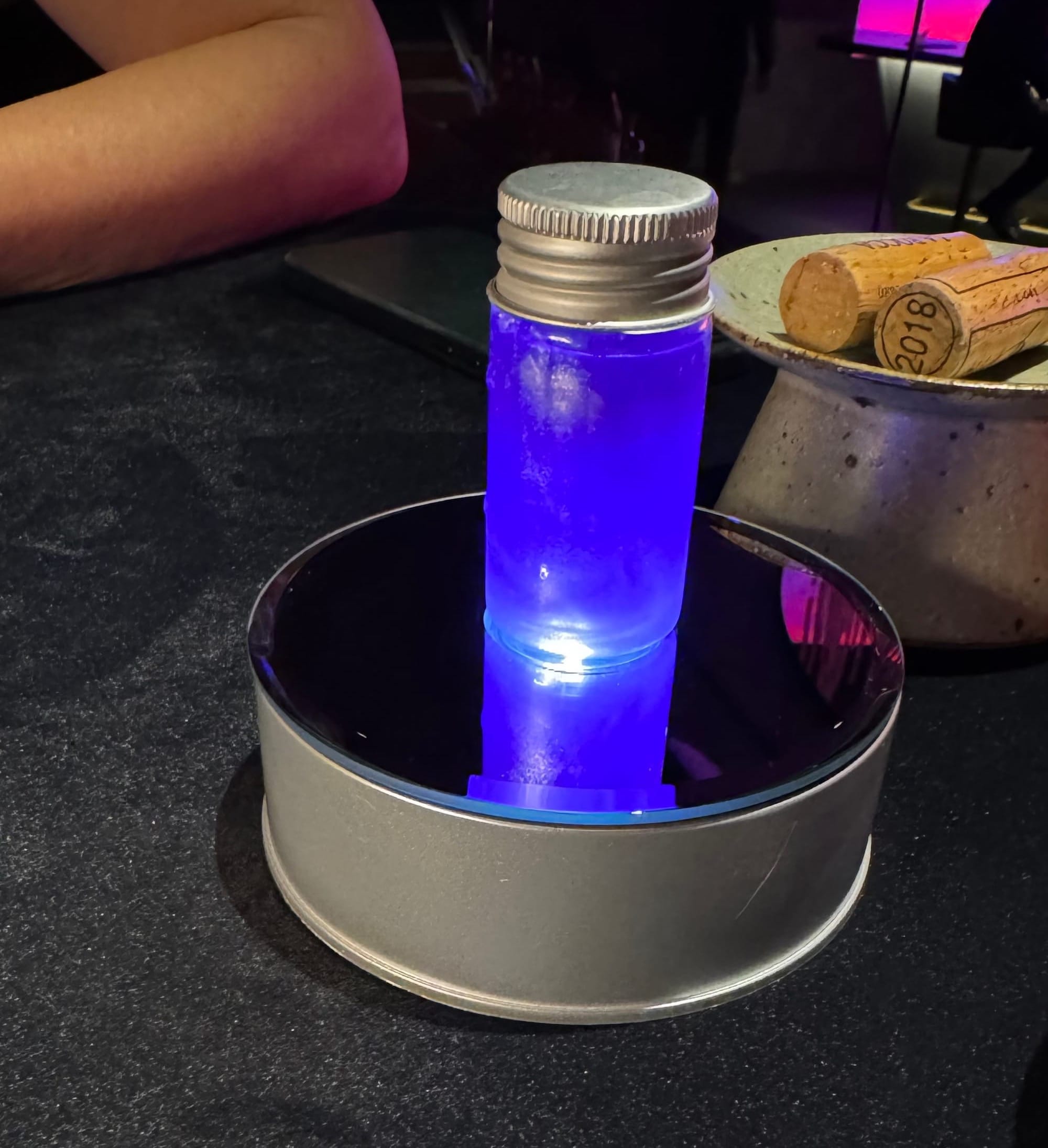 Now on to the three dessert courses and which did not disappoint. They brought out this vial on a light and I joked, maybe we can drink it. Although I thought it was just for decoration, it was actually for the next course.