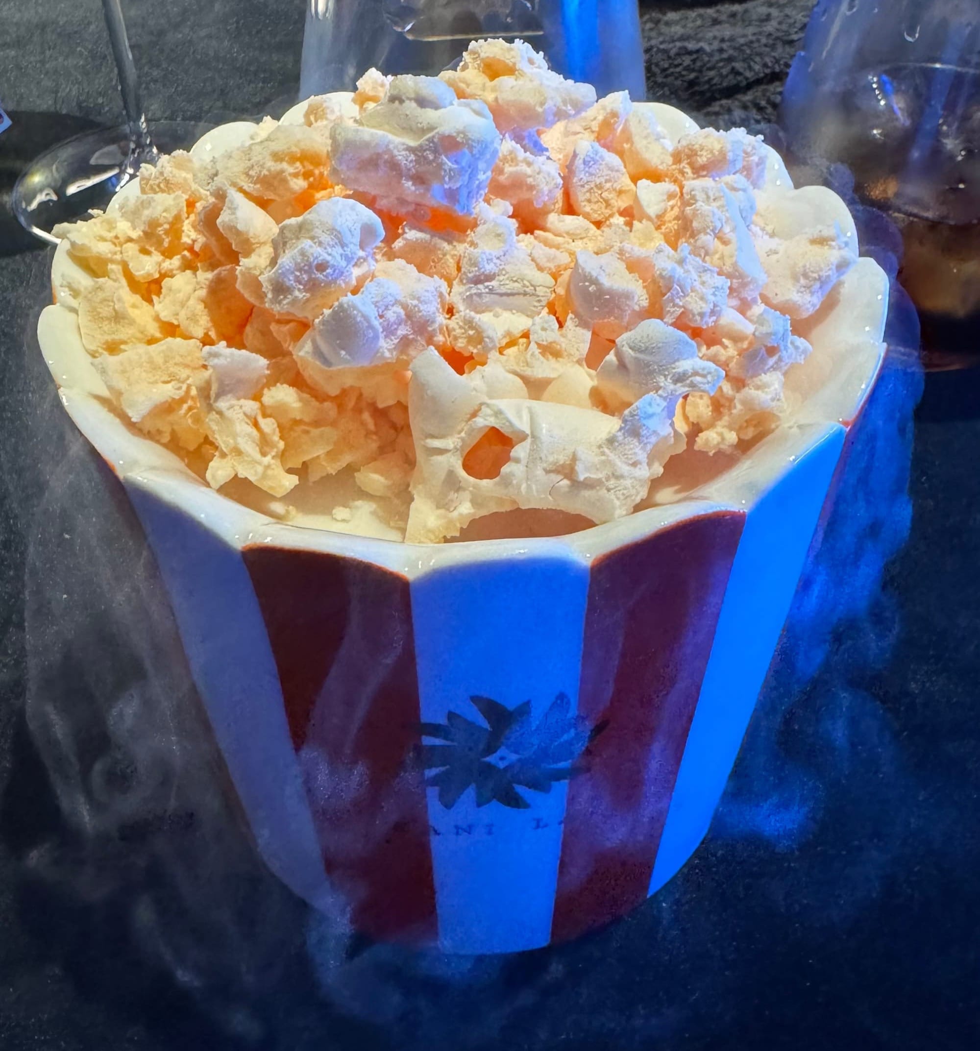 Popcorn? No! Freeze dried Aperol Spritz to kick off the meal and it was a hit. Our first smoking dish that was a great start.