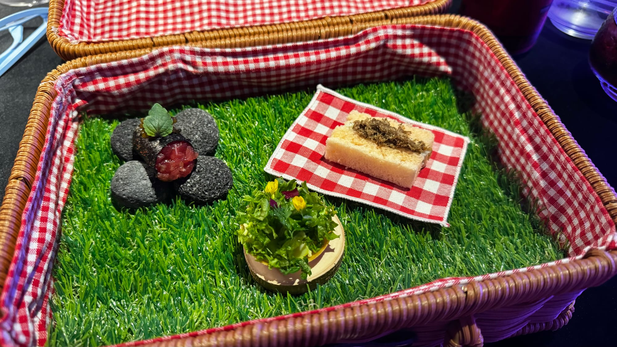 This course was called picnic. A little salad in a tartlet, a tuna roll called Gimbap and a crab sandwich. Crab will be a recurring theme in this meal.