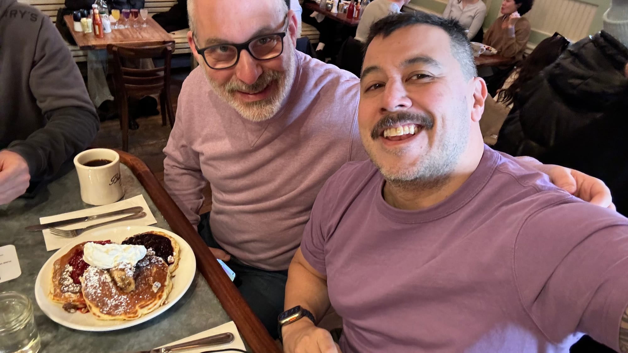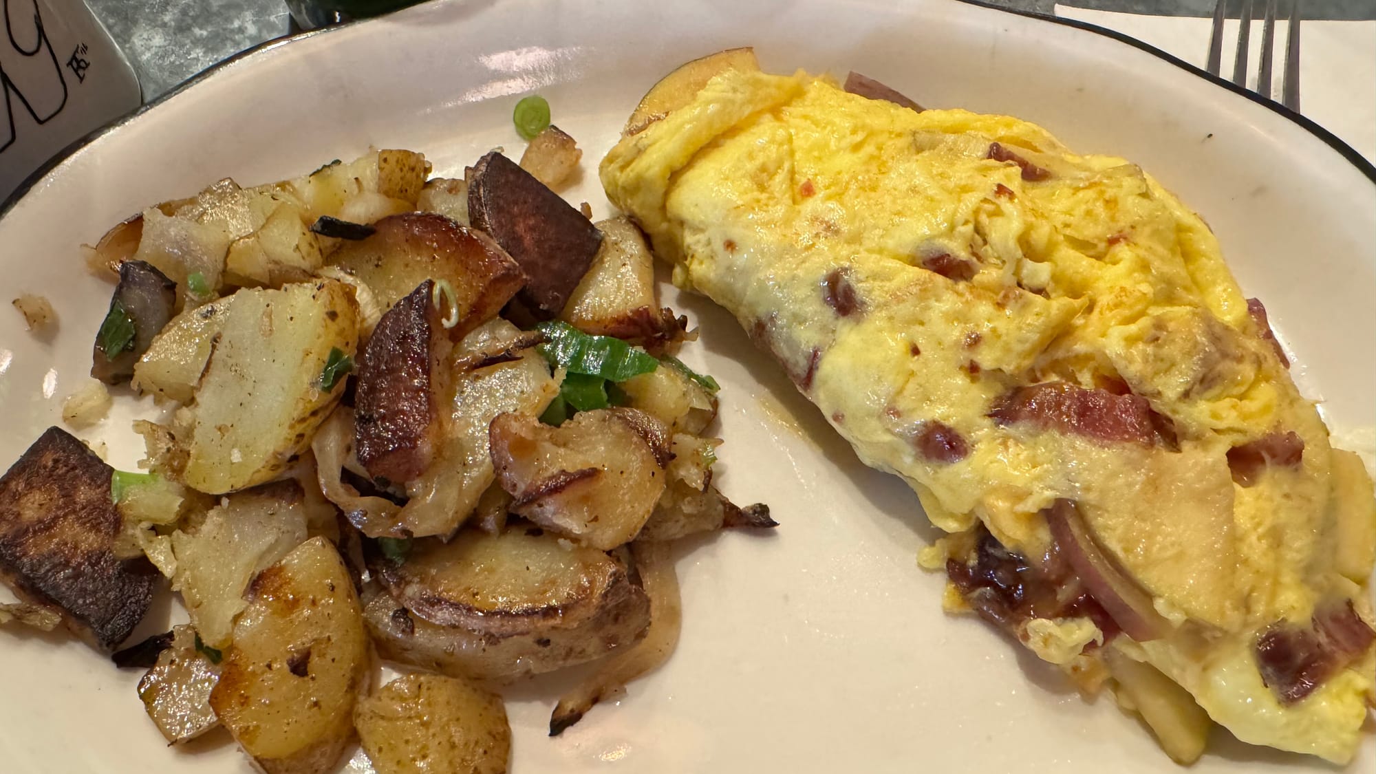 The food was quite delicious, I didn’t have the pancakes despite the image, that was Brad’s. I had pancakes the day before, but Brad let me try and these were way better. I had an omelette, a combination of ingredients that I have never heard of… bacon, cheddar, and apple. In an omelette! And it was delicious.