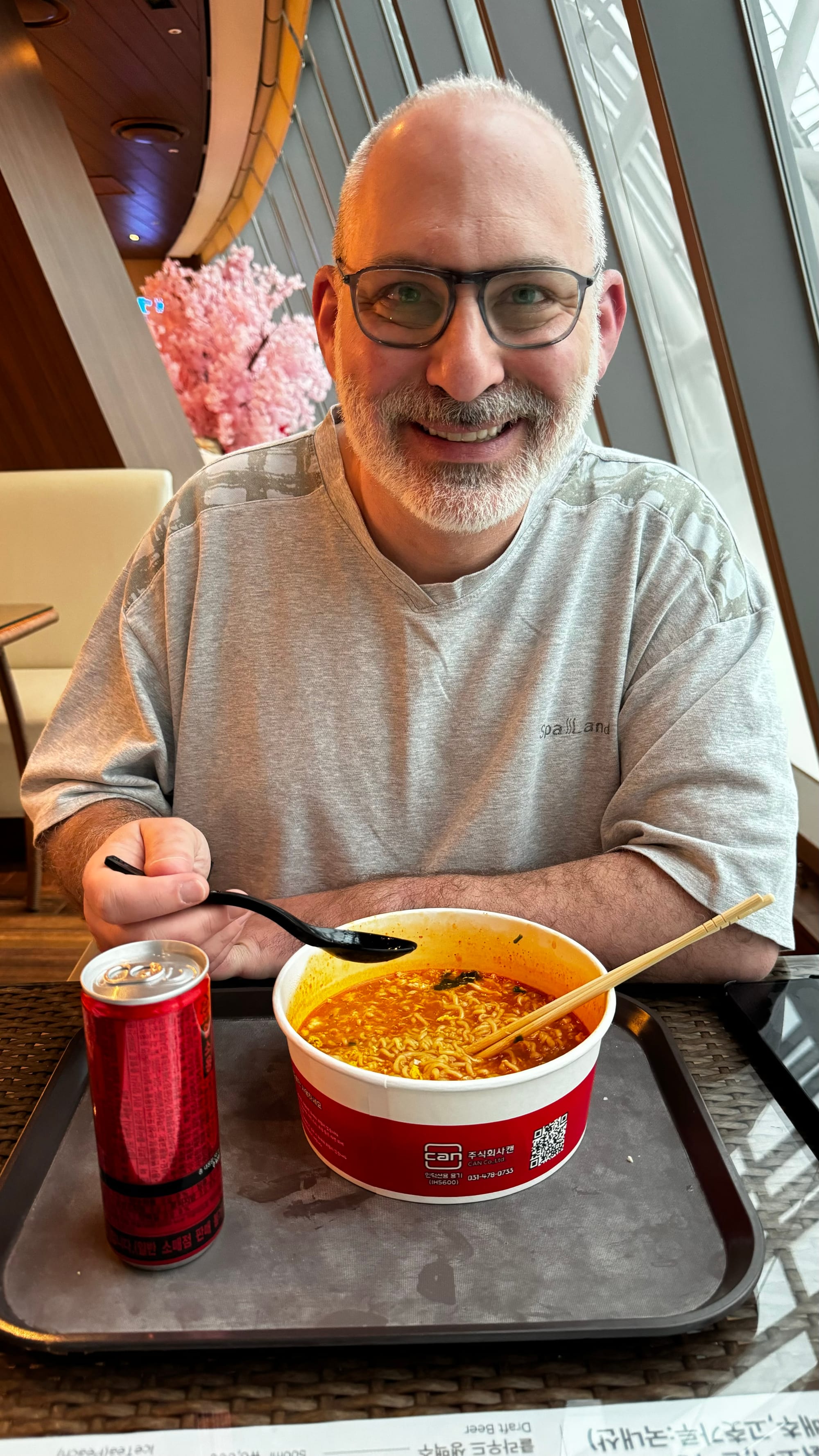 As for food there is a snack bar, restaurant and a DIY Ramen bar. We opted to adventure into the realm of Ramen. You purchase the paper bowl and select the flavour of ramen to make. Selection is actually the hardest part because all the packaging is in Korean. After you add the contents into the bowl, the noodles and packets of seasoning, there are additions like bean sprouts, green onions, and mini weiners. Of course, I took the mini weiners. They also provide eggs if you want to mix one in. This was my first DIY ramen experience. You put the bowl on the machine and after you start it, the water pours and it brings it to a boil with a 4 minute countdown. With 1 minute left you need to get that egg in there if you are so inclined. I will never say no to an egg. I enjoyed it… and I really liked my noodles.