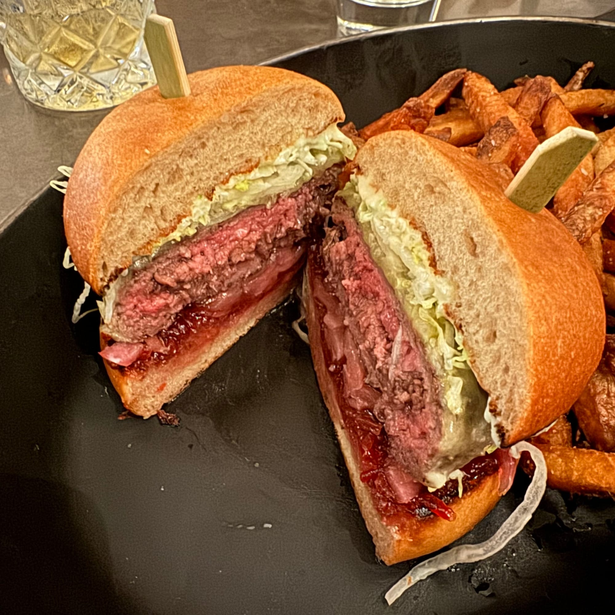 Steven: Not a smash burger, more of a fine dining burger where they suggest a medium rare cook. I am normally hesitant to get anything less than medium well but I have heard so many good things about this burger, I gave in. It was tasty, a different feel as the moist medium rare meat and the sauces really come together to be a mouthful of moist goodness. Fries: I felt they were a little over done.