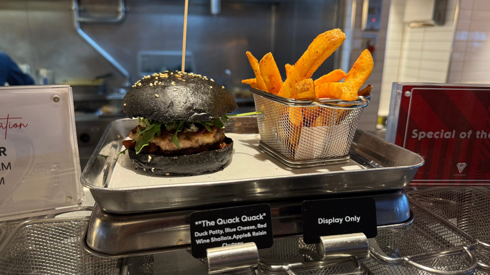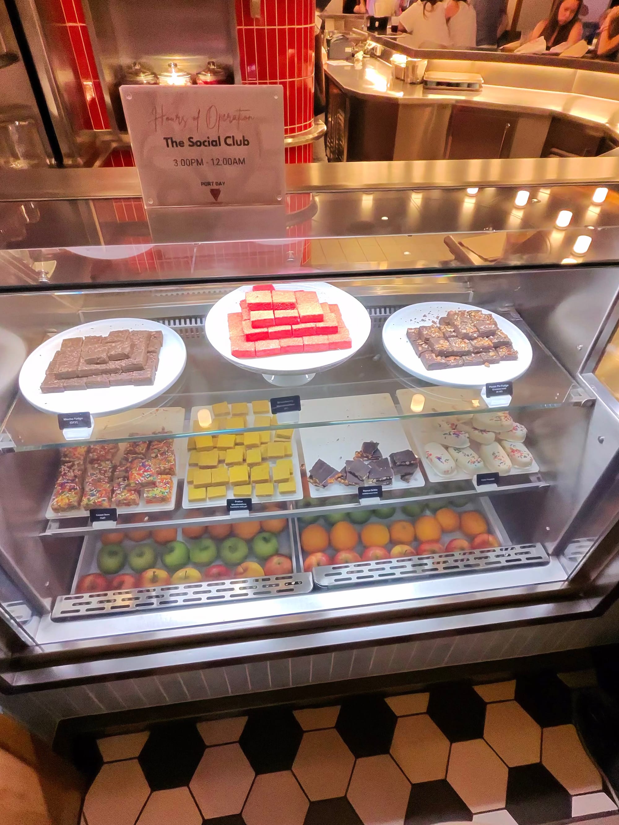 The galley kitchen area is instead of the classic cruise buffet. They have a bread / dessert station, made-to-order salads, sushi bento boxes, fresh sandwiches / paninis, all-day breakfast, a burger and hot dog bar, and specialty food. I had a big, luscious piece of suckling pig the other day. The food rotates, so I always make sure I re-look at my options daily.